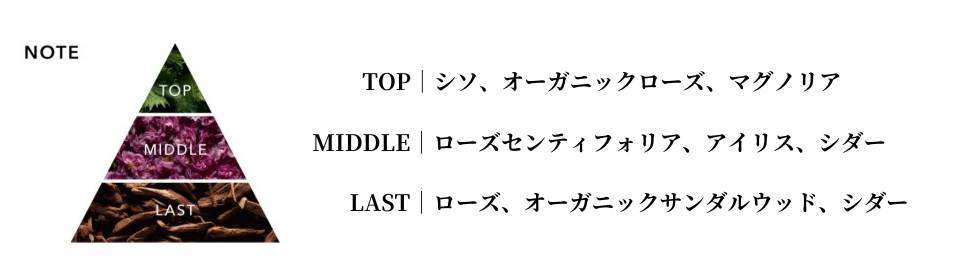 フローラルノートの組み合わせが鮮やかに際立ち、アロマティックノートとウッディノートのやわらかさが続きます。