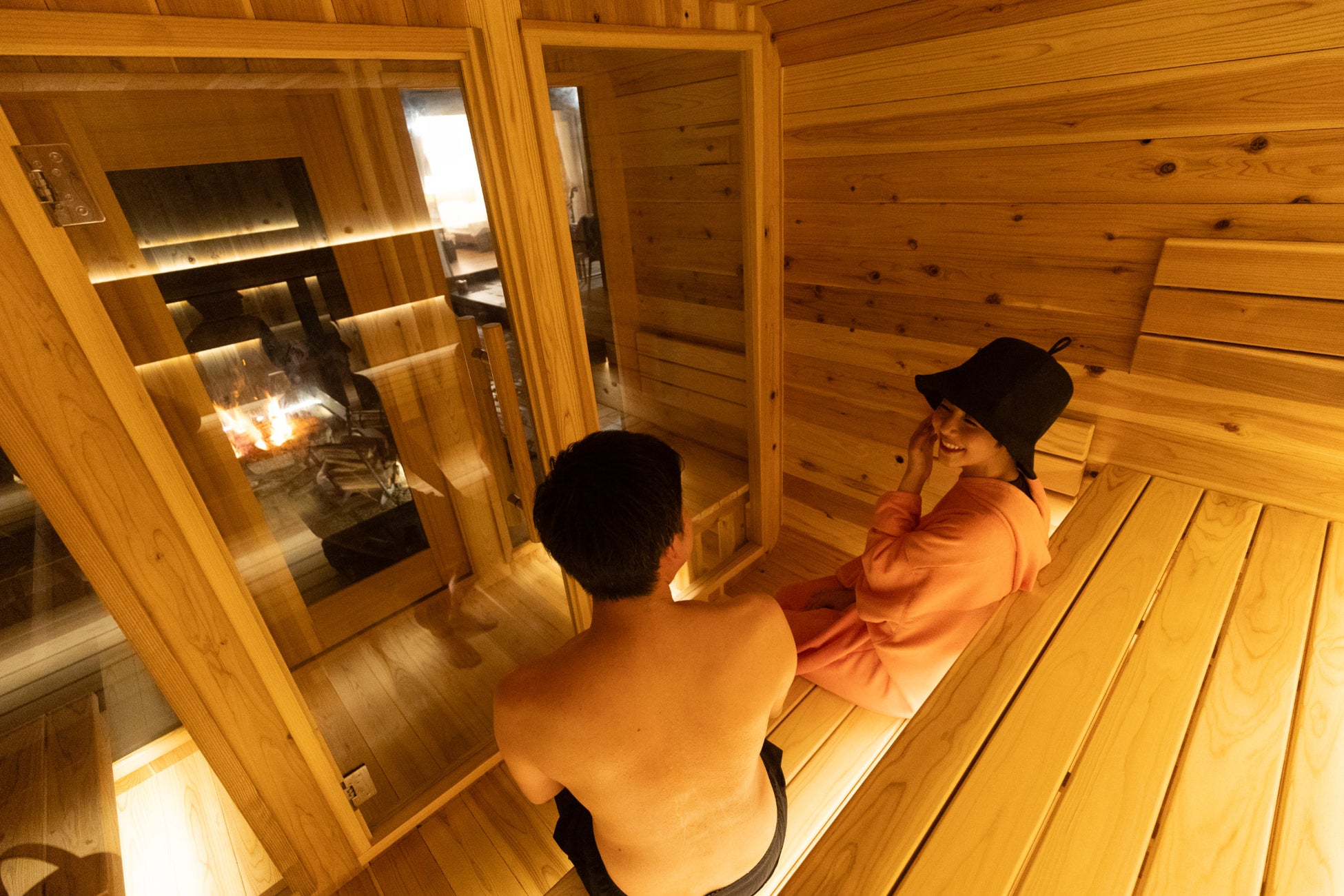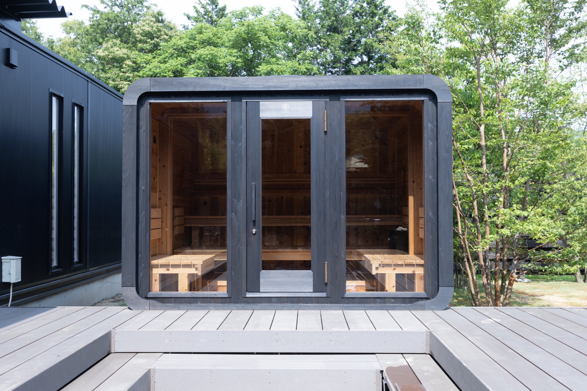「SAUNEA白州」は、サウナメーカー「SAUNEA」がこだわり抜いた極上のサウナ体験ができる宿泊施設で、施設の中心に設置された自社製造のアウトドアサウナキャビン「RIISI(リージ)2700」はサウナ室内の熱気を逃さないよう前室を作り、寒冷期でも最高の環境を維持できるように工夫されています。