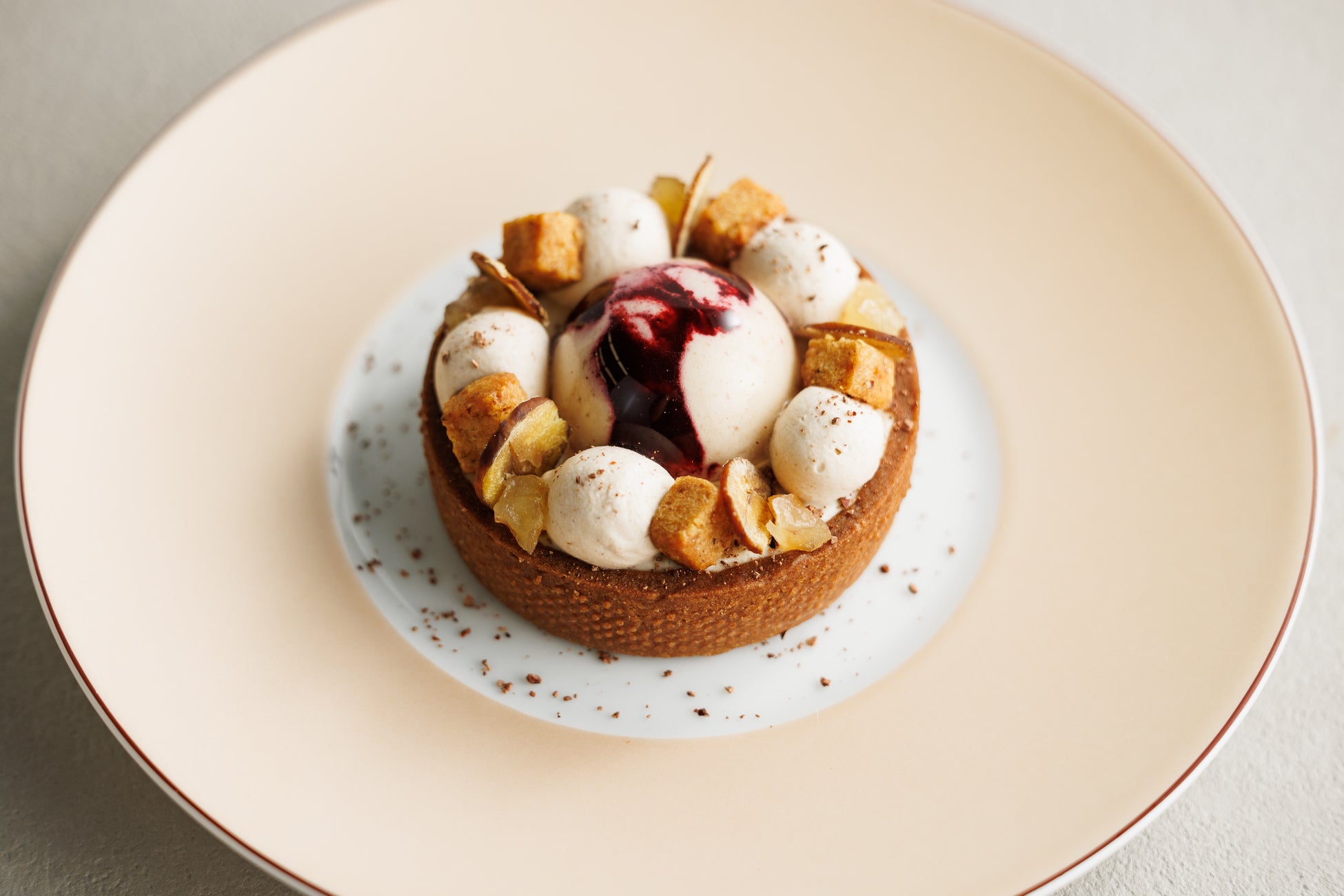 秋の味覚、マロンを使ったタルト。サクサクのタルトの中にはカカオ75%のオリジナルブレンドショコラを使った滑らかなクリームとブルーベリーのコンフィをアクセントに入れたマロンクリーム。仕上げには、マロン風味のシャンティクリームとヘーゼルナッツパウダーを使って焼き上げたサクサクとした食感が特徴的なシュトロイゼル、そしてマロンチップを華やかにトッピングしました。