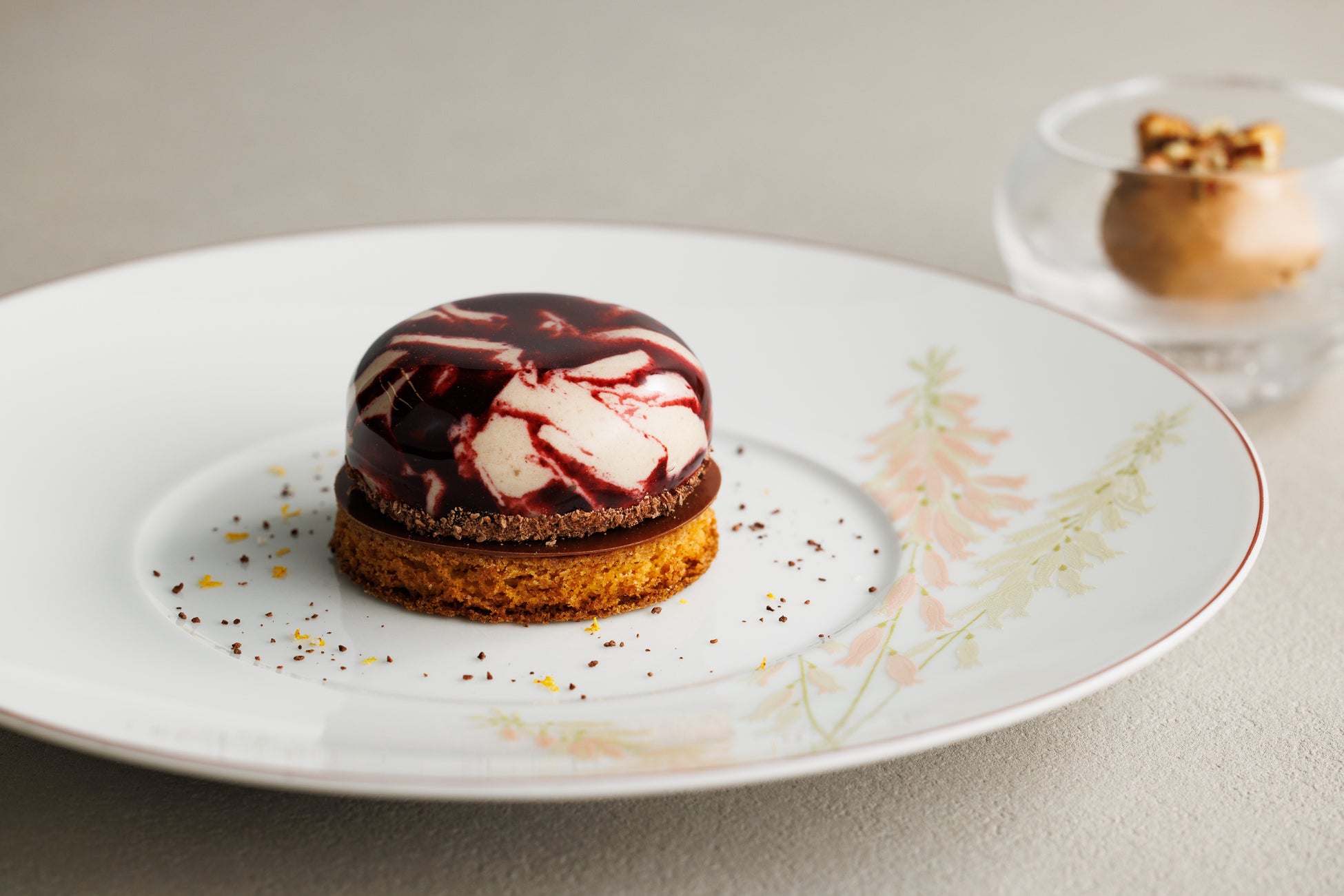 マーブル模様のドーム型が印象的な、芸術品のような“進化系”モンブラン。「ル・ショコラ・アラン・デュカス」が独自の世界観で表現するモンブランは、ブルーベリーの酸味をアクセントにしたマロンムース、ショコラのディスク、ショコラのスポンジ生地、そしてバターの香り広がるサブレブルトンが層になり、様々な食感と味わいをお楽しみいただけます。キャラメリゼしたピーカンナッツをトッピングしたショコラアイスとご一緒にお召し上がりください。