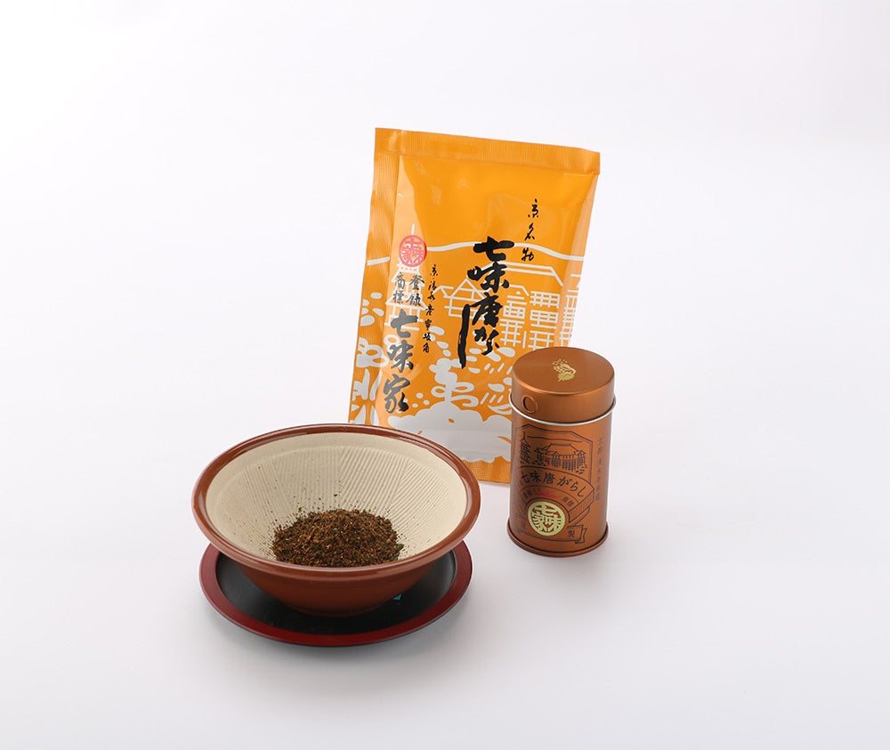 七味家本舗様の七味をイメージしたオレンジ色を基調とし、清水寺のイラストを入れたパッケージです。