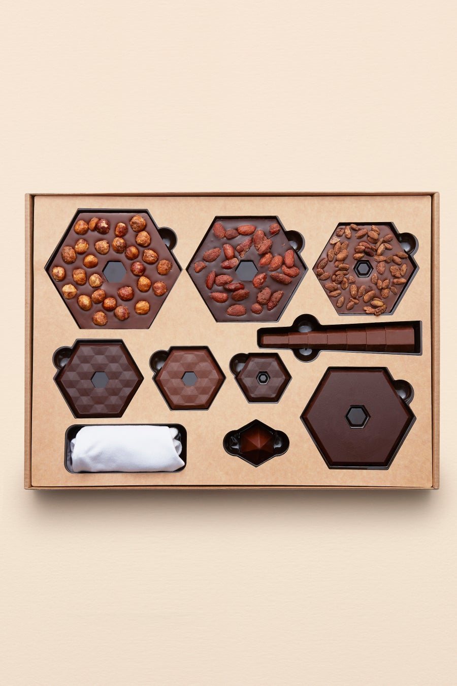 6角形のショコラディスクを組み立てて完成させるクリスマスツリーは、東京工房のオープンから愛され続けるクリスマスの定番アイテム。今年はマダガスカル産カカオ45%のオ・レとオリジナルブレンドカカオ75%のノワール2種のショコラにマンディアンタイプとシンプルなショコラを組合せました。大きな箱に入ったショコラを付属の手袋を付けて組立てるのも楽しみのひとつ。パーティーを盛り上げてくれること間違いなしのアイテムです。¥14,040