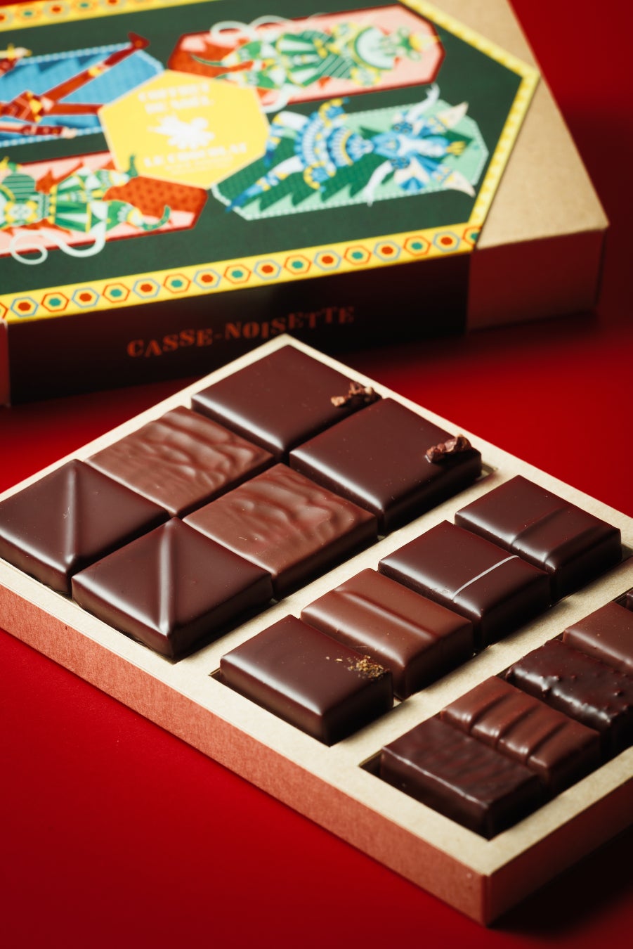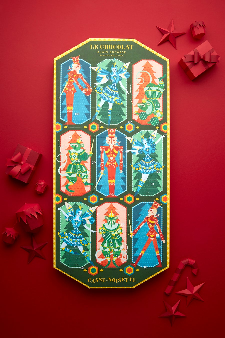 毎年人気のアドベントカレンダー!今年は、くるみ割り人形をはじめ、ネズミの王様、ドラジェの精など物語に登場するキャラクターをクラシックなタッチで描いた華やかなデザイン。24個の窓の中には、7種のペピット、ナッツをのせたミニマンディアン、ドラジェ、クリスマスツリーを模ったショコラなど24種類のクリエイションが入っています。24日の大きな窓からは、ヘーゼルナッツのプラリネをたっぷり詰め込んだくるみ割り人形のデザインを施したショコラが登場!クリスマスまでのカウントダウンを、風味豊かなショコラと共にお楽しみください。¥10,800 *数量限定(なくなり次第終了)