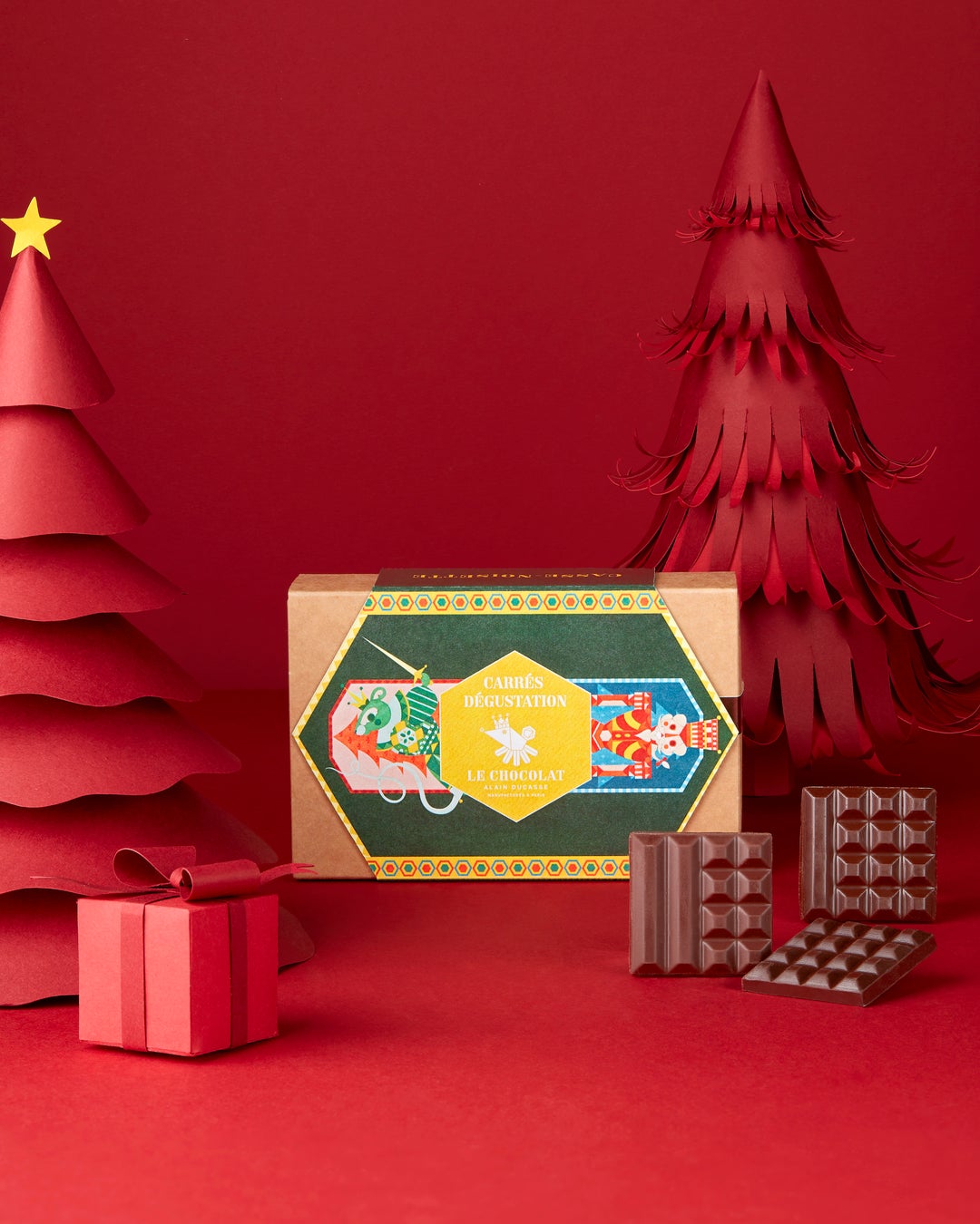 マダガスカル、ペルー、ジャワの3つのカカオ産地の味をシンプルに楽しめる定番商品「コフレ・カレ・デギュスタシオン」をクリスマス限定パッケージでご用意します。幾何学デザインが特徴的な一口サイズのショコラは、家族や友人とシェアしながらも楽しめます。¥3,996