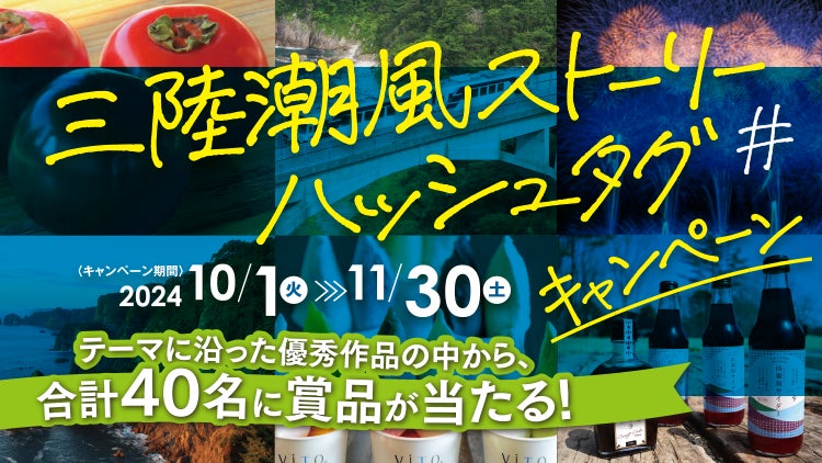 岩手・三陸で、秋の観光キャンペーンとして、「三陸潮風ストーリー ハッシュタグキャンペーン」を実施します。「いわて三陸の魅力なないろ」をテーマに、秋の岩手・三陸で見つけたグルメや風景などの写真を撮影し、「#三陸潮風ストーリー」と「#○○市」などの市町村名の2つのハッシュタグをつけてInstagramに投稿しよう!