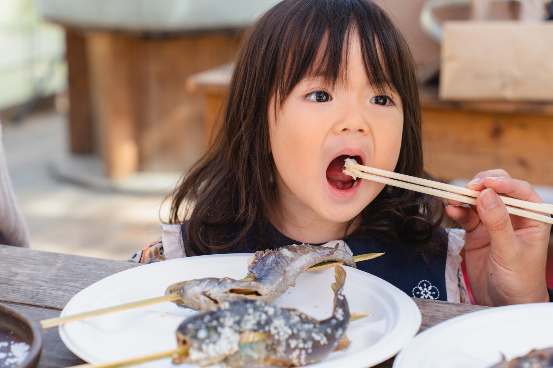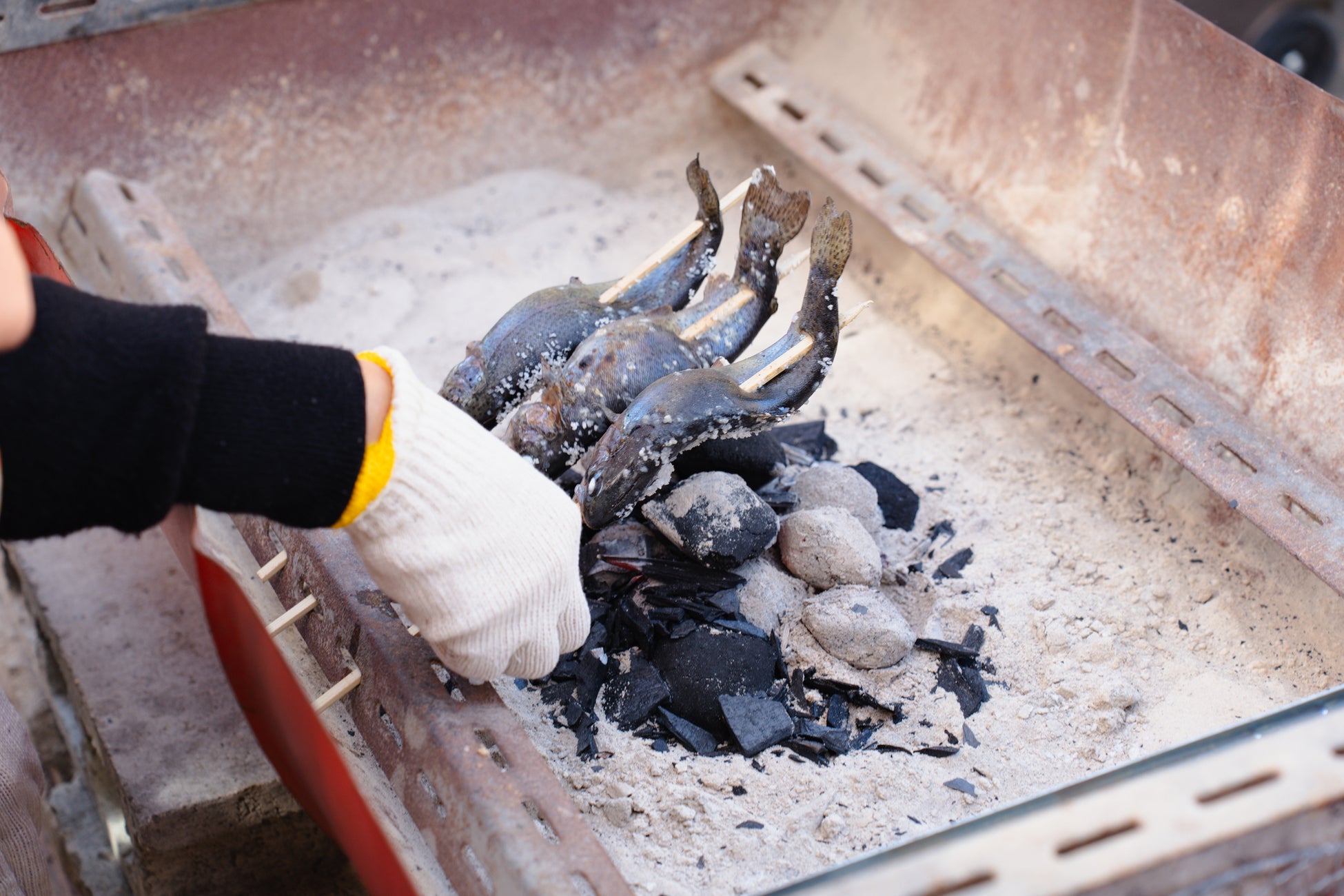 釣ったニジマスはその場で塩焼きにして食べられます。