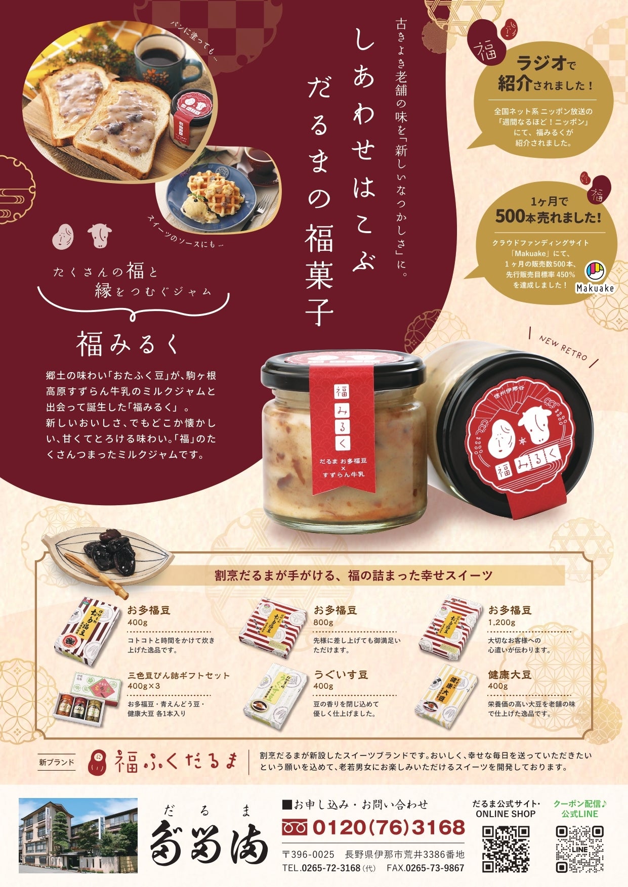 しかし、この危機を乗り越えるため、看板商品「お多福豆」を中心とした土産品販売に注力。そして、地元企業とのつながりを活かして、若い世代にも魅力を発信するべく、新ブランド「福ふくだるま」を立ち上げて、新商品「福みるく」を誕生させました。