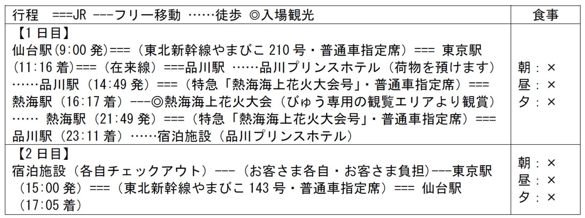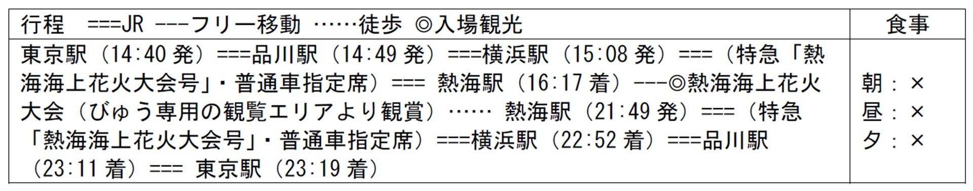 ●熱海駅到着後、花火大会開始までの約4時間は、熱海駅周辺を自由に散策いただき、お楽しみください。● 宿泊プランは 翌日の東京駅発車時刻までフリータイム ですので、東京観光をお楽しみください。