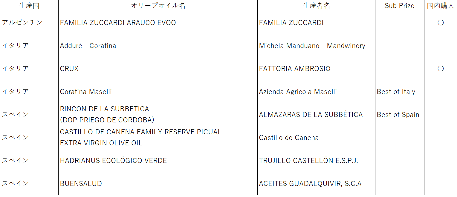 世界各国から、エントリーされた766品の中から、選ばれたオリーブオイルは下記の通りです。