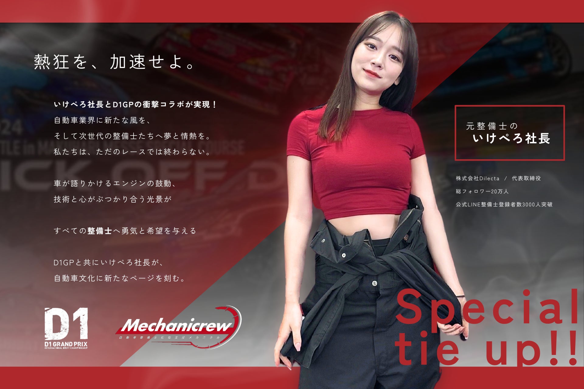 株式会社Dilecta(本社:東京都、代表取締役:池田陽花、以下「弊社」)は、オートサロンやD1GPを運営する株式会社三栄とのタイアップにより、弊社代表取締役である池田陽花(元整備士のいけぺろ社長」)がD1グランプリシリーズのオフィシャルピットレポーターに就任することを発表いたします。